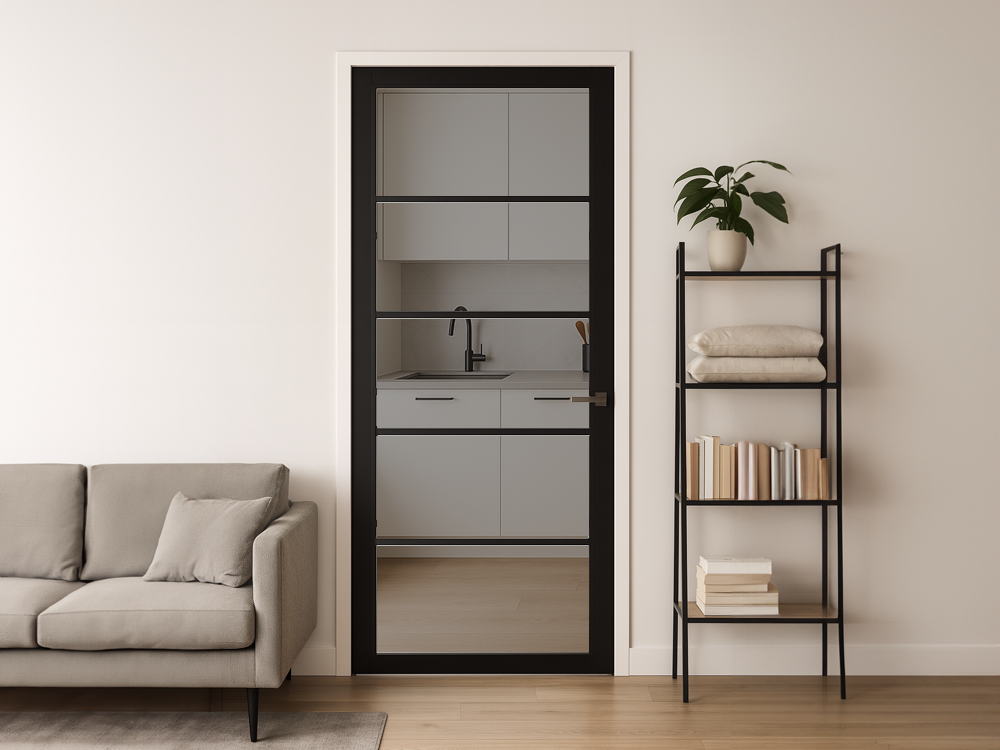 De Cando Cover Glass COV3-DE03 is een luxe binnendeur met glas in Carbon Black. Met rookglas voor privacy en stijl, en een stevige volspaan kern voor geluidsreductie. Afgewerkt in krasvaste EBC-lak en direct te monteren. Perfect voor een industrieel of modern interieur.