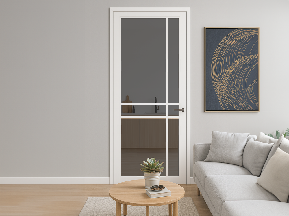 De binnendeur heeft een solide volspaan kern, waardoor hij robuust en geluidswerend is. Het rookglas zorgt voor een open en lichte sfeer met luxe uitstraling. Dankzij de hoogwaardige afwerking in EBC-lak blijft de afwerking jarenlang strak en bestand tegen krassen en intensief gebruik.
