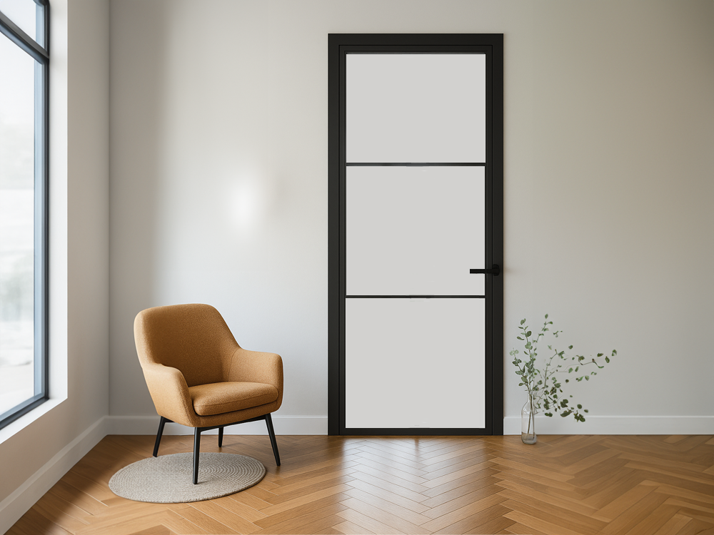De Cando Cover Glass COV3-FD01 is een binnendeur met strak donkergrijs frame en mat glas. Deze deur biedt privacy, lichtinval en een industriële uitstraling in elke woonruimte.