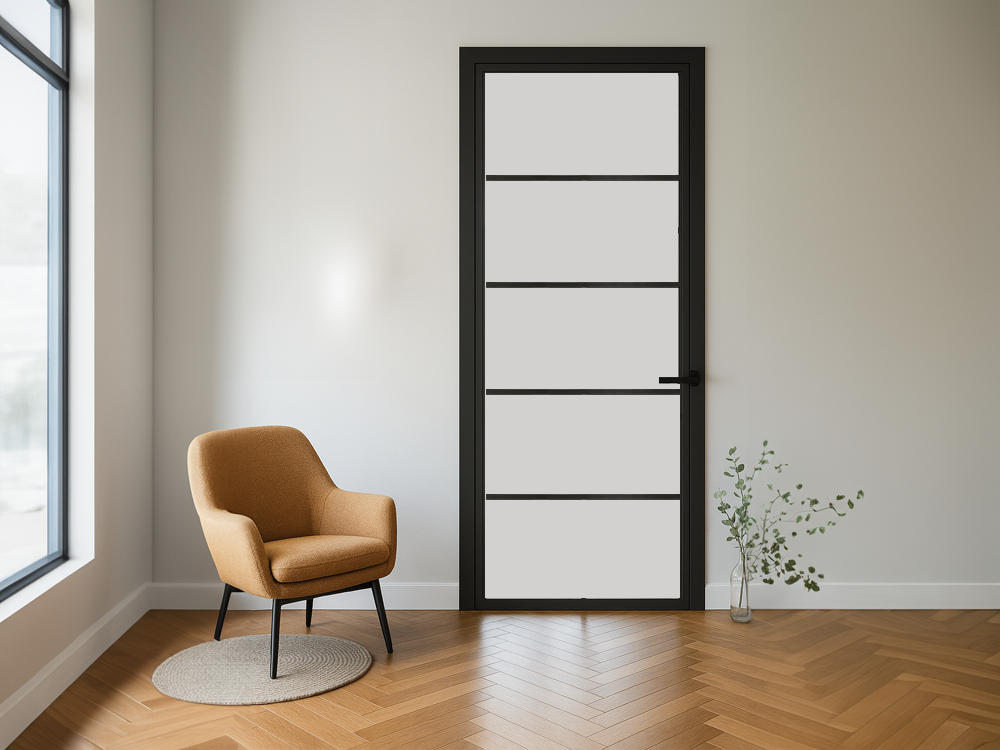De Cando Cover Glass COV3-FD03 is een binnendeur die design en functionaliteit op een unieke manier samenbrengt. Het zwarte frame en de vier matte glaspanelen zorgen voor een moderne, industriële uitstraling die in iedere ruimte tot zijn recht komt.