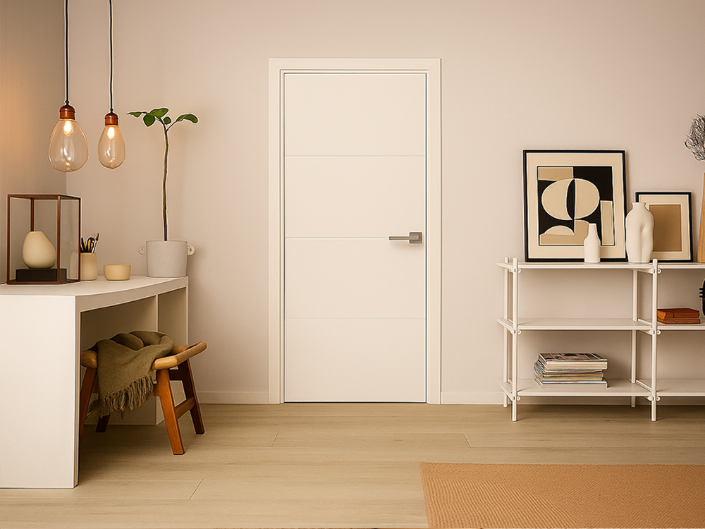 De Cando Cover Original COV1-BA04 is een moderne witte binnendeur die ideaal is voor wie houdt van een strak interieur. Met drie subtiele horizontale lijnen heeft de deur een minimalistisch maar toch karaktervol design. Hierdoor past deze deur perfect in zowel moderne als klassieke woningen.