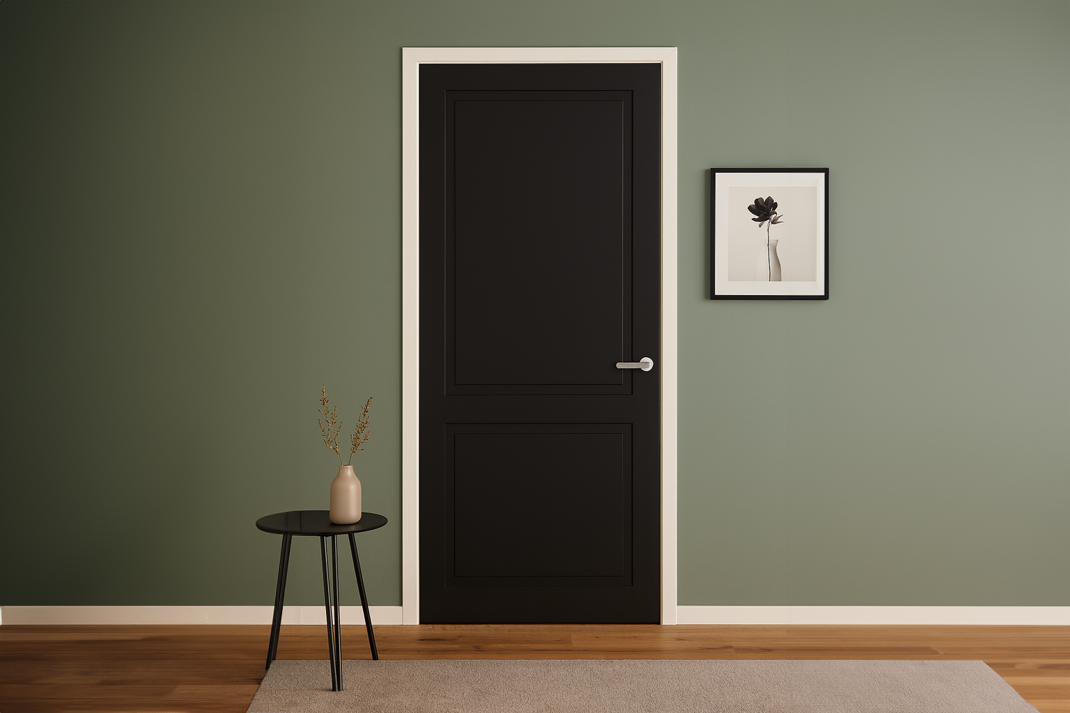 Dankzij de dubbele paneelverdeling voegt deze zwarte binnendeur rust en elegantie toe aan de ruimte. Het minimalistische karakter maakt de binnendeur geschikt voor uiteenlopende woonstijlen: van een modern appartement tot een industrieel loft of een strak ingerichte nieuwbouwwoning.