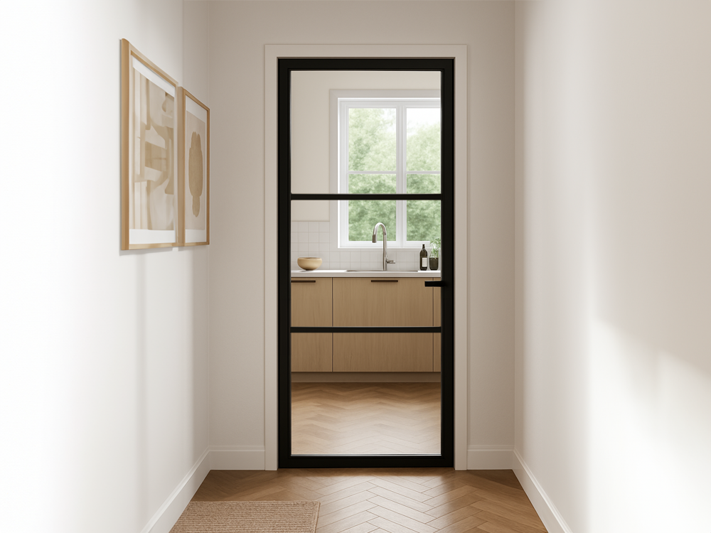Het grote glasvlak zorgt voor een open en lichte uitstraling, ideaal om ruimtes optisch groter te maken en meer verbinding te creëren tussen kamers. Dankzij de belijning behoudt de deur tegelijkertijd een stoere en moderne look.