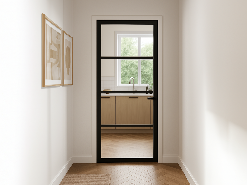 Dankzij de grote glasoppervlakken creëert deze deur een open en luchtige sfeer. Ideaal voor woonkamers, keukens of werkruimtes waar licht en verbinding centraal staan. Het glas geeft niet alleen transparantie, maar versterkt ook het gevoel van ruimtelijkheid in huis.
