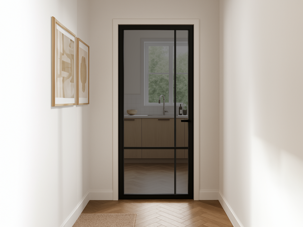 De Cando Elegant Original ELG1-1E04 is een moderne binnendeur met glas en een zwarte omlijsting. Dankzij het grote glasoppervlak ontstaat er veel lichtinval en een industriële uitstraling. Deze onderhoudsvriendelijke deur is duurzaam en blijft jarenlang een stijlvolle toevoeging aan jouw interieur.
